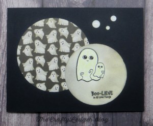 This cute card was made by stamping the image and sentiment from Boo-lieve on white cardstock .with Versafine black ink. I then filled in the ghost with a Ranger Perfect Medium pen and sprinkled on the Glow-in-the-Dark embossing powder, then used my heat gun to set it. I used Distress Ink in Pumice Stone applied with a blending brush to tone down the white after masking off the ghost. The patterned paper went well with the image.