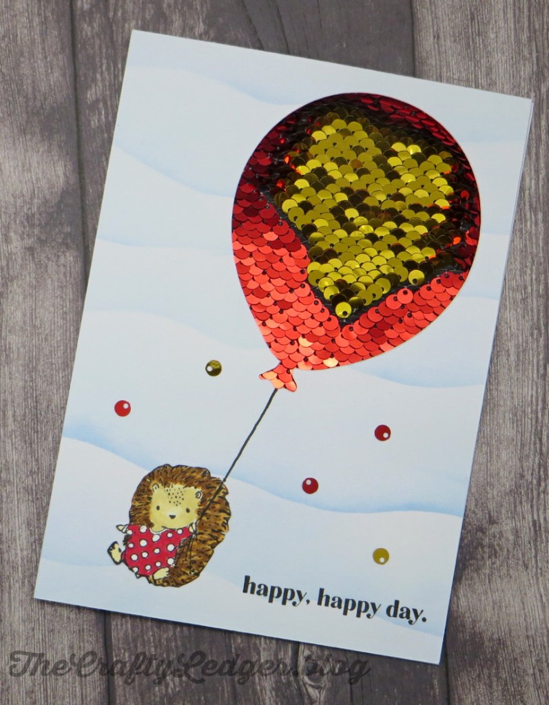 I love using my Cricut and these cards allowed me to utilize my Cricut along with my Unity stamps. I also wanted to use this neat reversible sequin material I purchased from Inky Antics. I watched a demo of this material during a virtual scrapbook show earlier this year and it appeared that larger images work better. I also looked at Pinterest for ideas and saw a lot of balloons, so I picked a couple of cute critters from the Hoppy & Hedgie and Koala-ty Friends stamp sets. After putting the cloud effect on white cardstock, using a blender brush, Memento Sky Blue ink and a wavy mask, I sized a balloon shape on my Cricut to fit on a 5 x 7 card and cut the card fronts. The animals were stamped on white cardstock and colored with Spectrum Noir markers, then fussy cut. I positioned the images below the balloon opening and hand drew a string to the balloon. Scrapbook Pal has this wonderful product called Scrappy Tape which is double sided tape. It comes in several sizes, but I love the 5″ wide roll to place on large items that I want to stick. I cut a piece to fit the back of the sequin fabric. It holds it tightly and evenly which helps when flipping the sequins. After adhering the sequin fabric to the front of a card base, the card front was glued on top. I added a few loose sequins that came off the edges of the material to fill in some of the empty space. The sentiment on the top came from the June 2017 KOM called Time to Enjoy Life, while the sentiment on the bottom came from the Hoppy & Hedgie set. Below are the cards with some of the sequins, flipped.